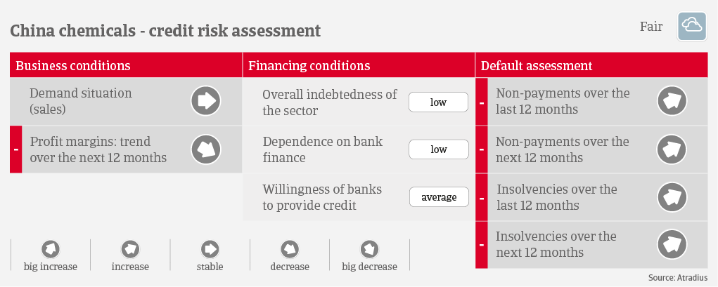 Overall margins of chemical businesses decreased in Q1-Q3 of 2022, due to increased energy and raw material costs. We expect no substantial improvement of profit margins in 2023. The lockdowns and supply chain disruptions in H1 of 2022 triggered liquidity issues for many businesses, and we observed an increase in payment delays and non-payments. We expect non-payment and insolvencies will increase by 5%-10% in the coming 12 months. This is because economic growth is forecast to slow from 8.1% in 2021 to 3.2% in 2022 and 4.9% in 2023 while the global demand for chemicals remains subdued. Covid-related restrictions continue to affect economic activity, although authorities have fine-tuned the zero-Covid policy in order to reduce supply-side disruptions.