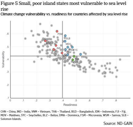 The small island states in the Pacific and the Caribbean generally have limited administrative and technical capacities and limited financial resources. However, there are differences. For example, the Maldives, a country with a relatively high GDP per capita, can be found in the quadrant with vulnerable countries that are more than average ready for the consequences of climate change. In order to guarantee the high income from tourism, the government has invested heavily in coastal reinforcement and land reclamation.
