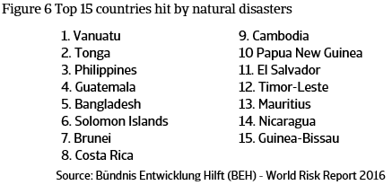 The impact of severe natural disasters is often relatively large for small island states, just as with the threat of sea level rise, and is therefore an important factor in determining the level of country risk. For several of the island states, ND-GAIN does not give a vulnerability score and therefore no ND-GAIN overall score. However, looking at only the readiness score of ND-GAIN for countries that have to deal with natural disasters (and which therefore also takes into account the extent to which these countries deal with other consequences of climate change), we can conclude that the picture is diverse. Mauritius, Brunei and Costa Rica score relatively well in this respect, while Guinea-Bissau, Bangladesh, Papua New Guinea, Nicaragua, Cambodia and Guatemala score poorly in terms of 'readiness'. Large countries that combine a relatively high risk of natural disasters with a poor readiness score are (again) Bangladesh and, to a lesser extent, the Philippines and several Latin American countries.