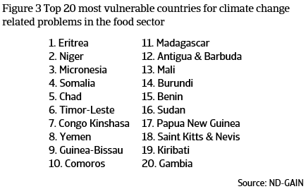 Failed crops increase food insecurity and deteriorate living standards in many countries. The ND-GAIN index also includes a so-called food score. It measures the vulnerability of a country to climate change in terms of, among other things, food production and demand for food. Indicators that are considered include the expected change in grain yields, expected population growth, dependence on food imports, population in rural areas and agricultural capacity. Figure 3 shows the countries that emerge as most vulnerable from this food index.
