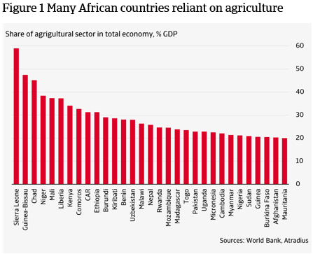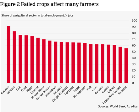 Agriculture is the sector most vulnerable to a rise in temperature and changed precipitation patterns. Risks include a decrease in production, an increase in pests and diseases and floods that affect infrastructure. The figure below shows all countries in the world where the agricultural sector as a percentage of GDP represents 20% or more. It clearly shows that mainly African countries are exposed to outsized agricultural sectors. In many of them, it concerns mainly subsistence agriculture.
