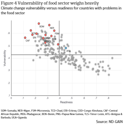 Figure 4 presents a matrix of the countries’ ND-GAIN scores for both their vulnerability and their readiness. Almost all of the most vulnerable countries listed in figure 3 are in the top left quadrant. This means that these countries are vulnerable and have taken few measures to adapt to climate change. Somalia (SOM) and Niger (NER) are in the weakest position. Antigua & Barbuda (ATG, in blue) has a poor score for the food sub-index and is also relatively vulnerable to climate change, but the country has already taken steps to address the consequences, bringing it in the top right quadrant.