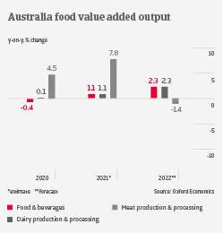 Australian food & beverages value added output is forecast to grow by more than 2% in 2022, after a 1.1% increase in 2021. The outlook is positive due to the easing of pandemic-related restrictions and ongoing overseas demand.