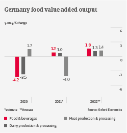 German food & beverages output is forecast to grow by about 2% in 2022, after increasing 1.2% in 2021, and a 4.2% contraction in 2020. Retailers have benefitted from higher consumer spending for premium food products, while food services businesses suffered from low hospitality and catering demand during the lockdowns.