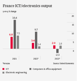 The French ICT market recorded robust growth in 2021, driven by the surge in remote working and digitalisation needs. However, demand is slowing down after peaking during the pandemic. The market for computers and smartphones is more mature, and we expect a 4% decrease in value this year.  Ongoing supply chain issues (transportation bottlenecks, semiconductor shortages) have a strong impact on French ICT businesses, leading to sharp input price increases and less product offerings. Recent lockdowns in China have exacerbated this effect.