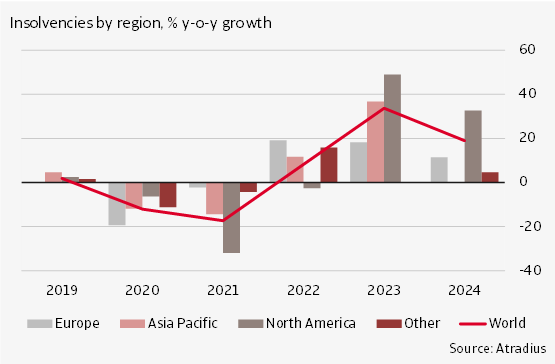 The insolvencies adjustment process, which was already initiated in 2022, is continuing at an accelerated pace in 2023. The phasing out of fiscal support measures and the lifting of temporary changes to insolvency legislation have had an effect on the level of insolvencies. After a global increase of 9% in 2022, we expect a 34% increase in in 2023. We are seeing rising insolvencies across all regions, with North America experiencing a relatively strong increase, while Europe is seeing milder increases. The majority of countries in each region can expect rising insolvencies this year. In 2024, the picture is more mixed. While we still expect an increase for most markets, the percentage increase is lower than in 2023. On a global level, we predict that insolvencies in 2024 rise by 19% compared to 2023. By the end of 2024 insolvencies are expected to have more or less normalised compared to pre-pandemic levels.