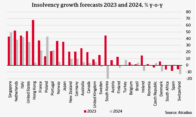 • For 2024 we still see a global increase in insolvencies mainly driven by a minority of markets that started the post-Covid adjustment later or did not start yet or has started later. We expect the sharpest increases for Singapore (49%), Poland (43%), Italy (42%), Netherlands (39%) and United States (35%). Nonetheless, for the majority of markets the level of insolvencies stabilizes.