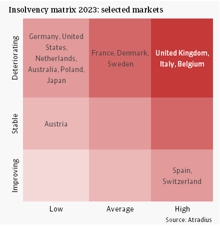 For the majority of countries, the trend is deteriorating in 2023, but the overall level remains low compared to the pre-pandemic level. Spain and Switzerland are the only two countries with an improving insolvency trend, as indicated in the previous paragraph. The United Kingdom, Italy and Belgium are in the most worrisome position from the selected markets, as the trend is deteriorating in 2023 and the insolvency level in 2023 is moving above 120% of the 2019 level. The UK is a particularly interesting case as insolvencies already returned to normal, pre-pandemic levels in 2022, together with the bankruptcy of zombie firms. However, the low growth environment is expected to push insolvencies even higher in 2023. In Belgium, the normalisation of insolvencies started in 2022 and is continuing in 2023. In Italy, the adjustment is very much taking place in 2023, leading to a deteriorating trend.