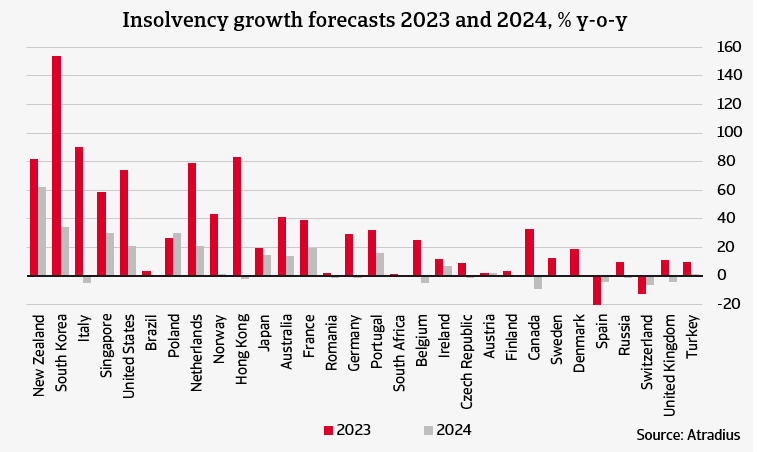 • In 2024, we forecast relatively high insolvency increases in New Zealand (62%), South Korea (35%) and Singapore (30%).