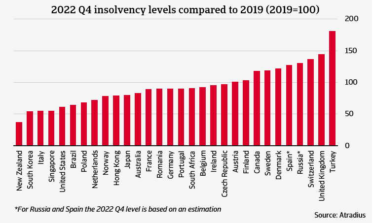 • In 2023, we expect sharply rising business failures in South Korea (154%), Italy (90%), Hong Kong (83%), New Zealand (82%), the Netherlands (79%) and the United States (74%).