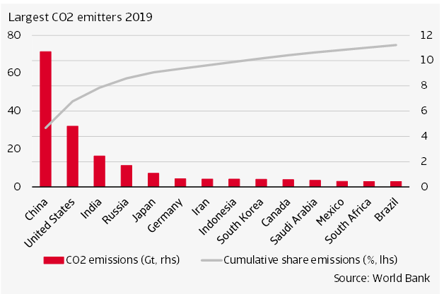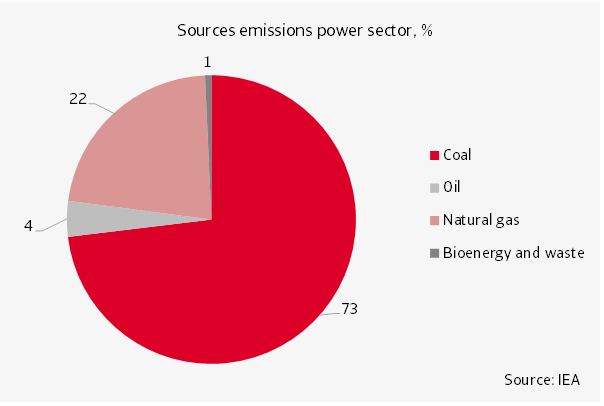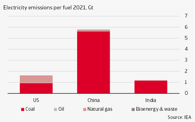 In the three most polluting countries, China, the US and India, coal accounts for most emissions in the power sector. Large steps need to be taken in particular in both China and India to accelerate the green power transition, as coal is by far the largest source of emissions there and is responsible for 62% and 73% respectively of generating electricity. This in comparison to 23% in the electricity mix of the US.
