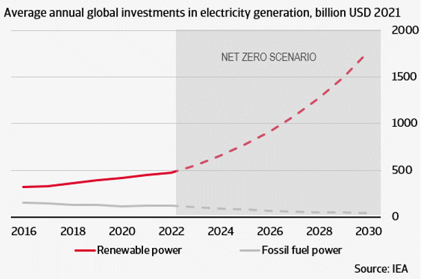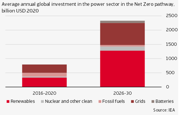 • To replace fossil fuel-fired power in the transition to net zero, enormous expansion of renewable energy generation capacity, electricity grids and battery storage is necessary. The recent energy crisis triggered a welcome acceleration of investment in renewable energy generation, but the annual global investment shortfall is still large.