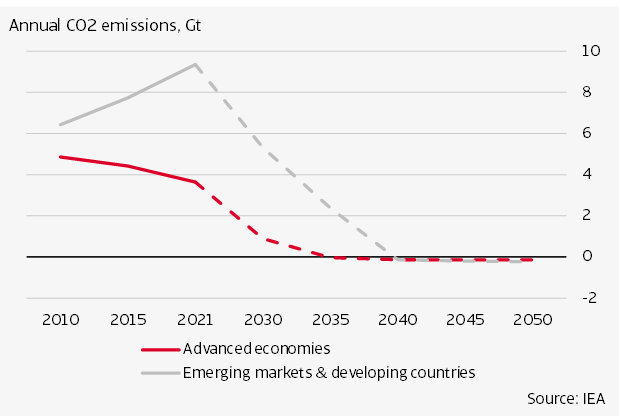 All countries will contribute to the pathway to net zero by 2050. That said, the speed of transition will differ. Countries will have their own pathways to decarbonizing the power sector depending on the existing sources, infrastructure, development and policies. Again, on a global level, the advanced economies will reach net zero in 2035 and emerging and developing economies have more time, reaching net zero in 2040.