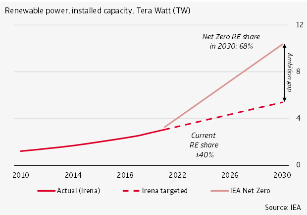 Among the countries that have set targets, the ambition levels differ greatly per country, but are on the whole not ambitious enough. While IRENA believes that the targets are achievable based on the current installed renewable energy capacity and the recent accelerated pace of new capacity additions, they will only bring renewable energy capacity half way of where it should be in 2030 under the net zero schedule (figure 10).