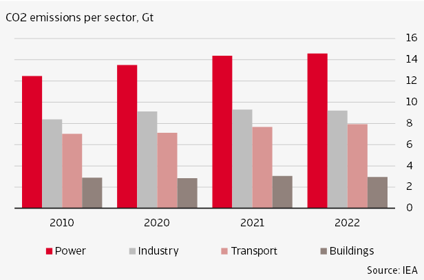 Costs of deployment of renewables have decreased rapidly in recent years and therefore make these a competitive alternative to coal and gas. Despite this, emissions have only risen further in the power sector, reaching 14.6 Gt in 2022. As the energy crisis showed us, the relatively cheap price of coal is still hard to resist. This could remain the case in light of rising global electricity demand, especially when renewables expansion remains below expectation. Burning of fossil fuels remains an easy way to fill this gap for certain countries.