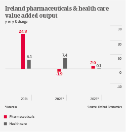 The small country accounts for more than 5% of global pharmaceuticals production, and recorded a whopping 25% increase in value added output in 2021. The highly export-driven Irish pharmaceuticals sector benefits from ongoing vaccine production and the global rebound in non-Covid related healthcare spending.