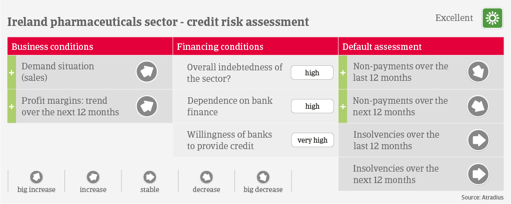 Financing of pharmaceutical producers is mainly driven by foreign direct investment made by parent companies. Banks are very willing to provide loans to smaller businesses, and private equity funding is also available. Payments in the industry take 60 days on average, and payment behaviour has been very good over the past two years. Compared to other Irish industries the insolvency level is very low.