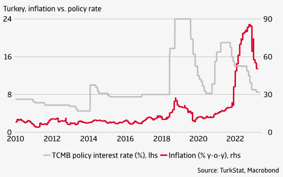 One of the key vulnerabilities of Turkey’s economy is high inflation, caused by an ultra-loose monetary policy, credit-driven growth and high global commodity prices. Since September 2021, the key central bank policy rate was reduced by 10.5 percentage points to 8.5% in March this year, despite very high inflation. The inflation rate rose to 85% year-on-year in October and November 2022 (figure 1). Despite easing somewhat in recent months due to favourable base effects, inflation remains very high (in April 2023 it was 44% y-o-y).